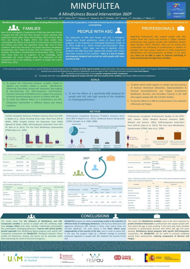 El programa MindfulTEA, es un programa de regulación emocional basado en mindfulness, para personas con autismo y altas necesidades de apoyo (discapacidad intelectual asociada), y sus familias. Este programa pionero en España, del que soy co-autora junto con otros profesionales especializados en mindfulness, ha sido posible gracias a la iniciativa, coordinación y  liderazgo de la Confederación FESPAU.